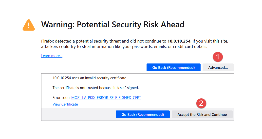 - NOTE: A page may appear stating that the website is not safe. This is due to the web interface using a self-signed certificate that an external authority cannot validate. This message can be ignored.