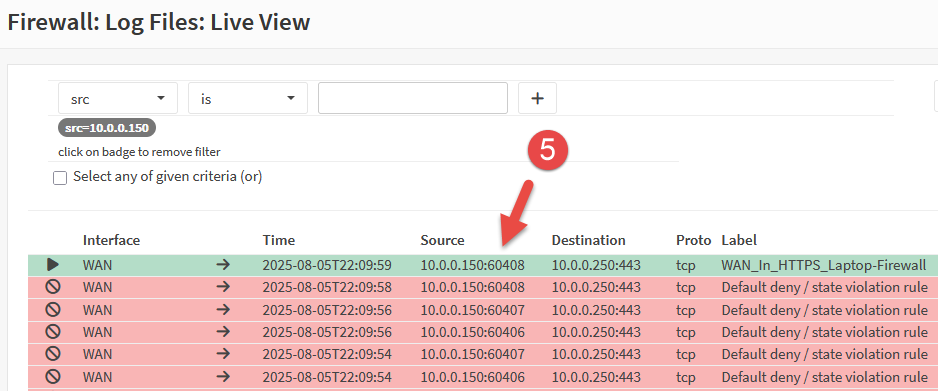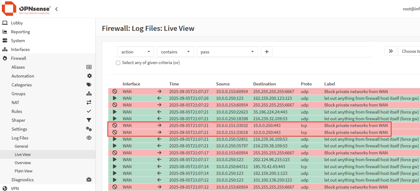 Evidence of this can be found in the firewall logs, accessible from Firewall > Log Files > Live View