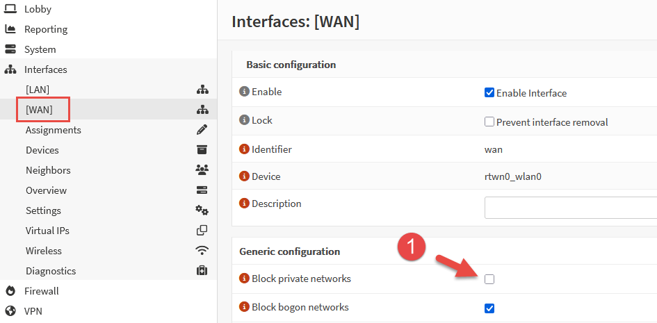 In order to remove the default rule blocking private networks from access via the WAN, navigate to Interfaces > WAN
