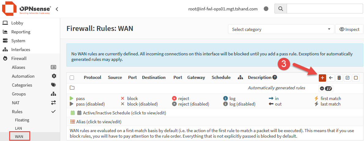 Lastly, we need to add a firewall rule to allow the connection, as all inbound WAN connections are blocked by default. Navigate to Firewall > Rules > WAN