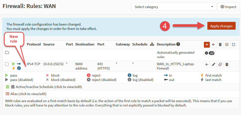 When the above settings are configured, click the Save button, followed by the Apply Changes button back on the rule table page.