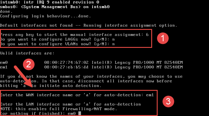 During the initial boot up process, OPNsense will try to detect the network configuration unless manually stopped during the autoboot process. Typically, it will select the first device with an existing IP addresses assigned via DHCP as the WAN interface. If custom WAN/LAN configuration is required or preferred (such as in my case), press any key at the prompt.