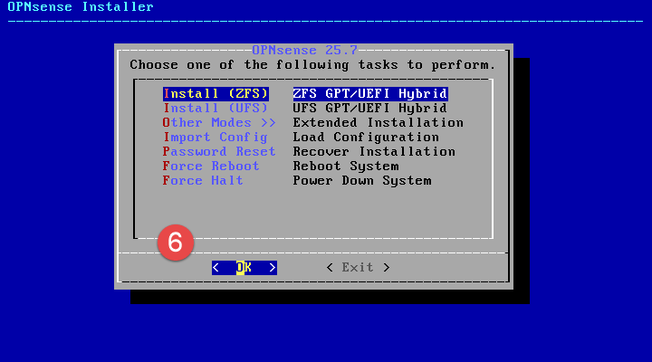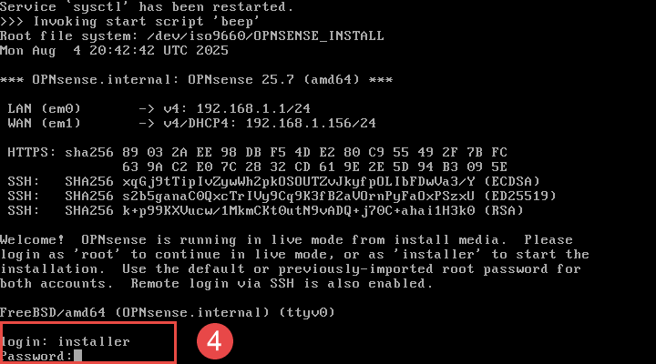 - NOTE: The default behavior of OPNsense is to boot into a live environment, therefore installation steps are still required post-boot process.