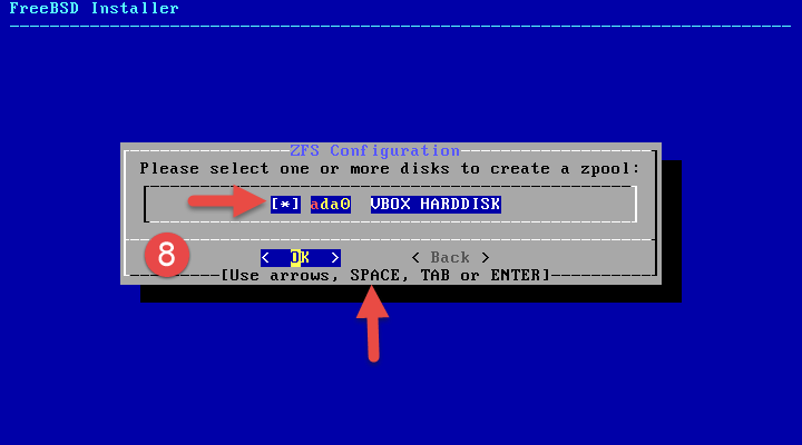Select the disk to install OPNsense on, making sure to use the spacebar