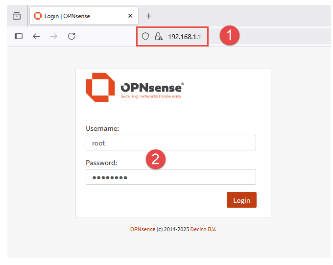 When OPNsense is done booting up, it will present the LAN interface IP address, on which the web interface can be accessed from another device.