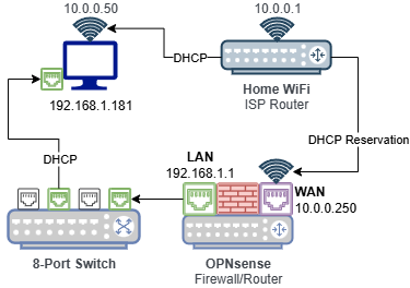 With this OPNsense device connected to an 8-port switch, my desktop is able to receive a DHCP provided IP address from the LAN-side DHCP server via Ethernet port, while still having Internet access via wireless connection to my home WiFi network. This allows access to the OPNsense web interface to perform initial configuration tasks.